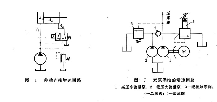 快速運(yùn)動(dòng)回路又稱增速回路,其功能在于使執(zhí)行元件獲得必要(如空行程)的高速,以提高系統(tǒng)的工作效率或充分利用功率。實(shí)現(xiàn)快速運(yùn)動(dòng)的方法一般有三種:增加輸入執(zhí)行元件的流量;減小執(zhí)行元件在快速運(yùn)動(dòng)時(shí)的有效面積;前面兩種方法的聯(lián)合使用。